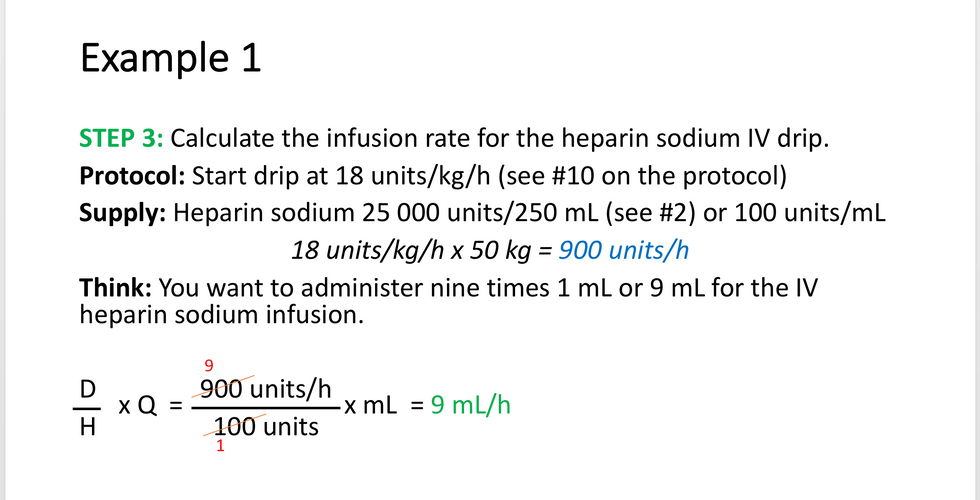 #10 indicates that this protocol, the standard heparin sodium dosage is 80 units/kg and the infusion rate is 18 units/kg/h. When the patient's response to heparin therapy changes, as measured by the activated partial thromboplastin time (aPTT) measured in seconds, the heparin sodium dosage is adjusted as indicated in #11 to #15. These orders are based on patient weight rounded to the nearest 10 kilograms. Some institutions use the patient's exact weight in kilograms. It is important to know the protocol for your clinical setting. Let us work through some examples of calculation of heparin sodium dosage based on patient weight and a standardized heparin sodium dosage protocol.